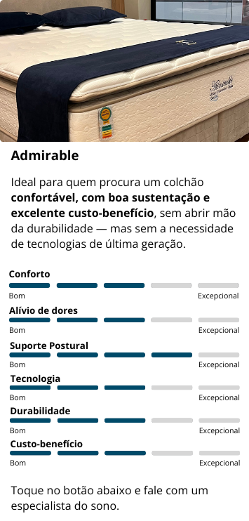 Dormir bem é uma escolha, e nós oferecemos o colchão certo para cada necessidade e de forma personalizada, com molas ensacadas, espumas tecnológicas e opções para todos os biotipos.